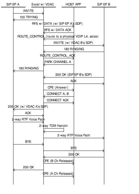 The following call flow shows how a traditional bearer-switched SIP-to-SIP call is established through the CSP. The CSP acts as a back-to-back user agent in that the SIP end-points signal with the CSP only, and connect to VDAC RTP ports. The VDAC RTP ports are internally connected over the Time Slot Interchange (TSI) fabric for an end-to-end speech path. This internal connection is the "hairpin."