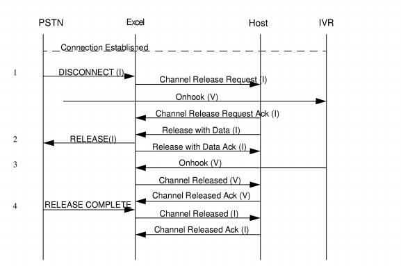 1. If the host had the option of "Channel Release Request on ISDN Disconnect" bit set in the ISDN Interface Configure message, the Channel Release Request message would get sent to the host. Otherwise, the host would not be notified of the call being cleared until receiving the Channel Released message. Also, as shown above, if the host did not have "Distant End Release Mode" or "Local End Release Mode" set to park, the Excel platform would automatically initiate clearing procedures on the channel included in the connection (IVR).