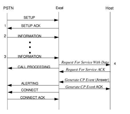 In the first two conditions, the Excel platform sends a CALL PROCEEDING message to the network and a Request For Service With Data message is sent to the host with all of the Called Party digits. When a timeout condition occurs, a 15 second L3 Q.931 timer (T302) is set after the Excel platform sends a SETUP ACK. This timer is reset when each INFORMATION message is received. If this timer expires before the Excel platform receives an INFORMATION message, the incoming call is cleared with a DISCONNECT message.