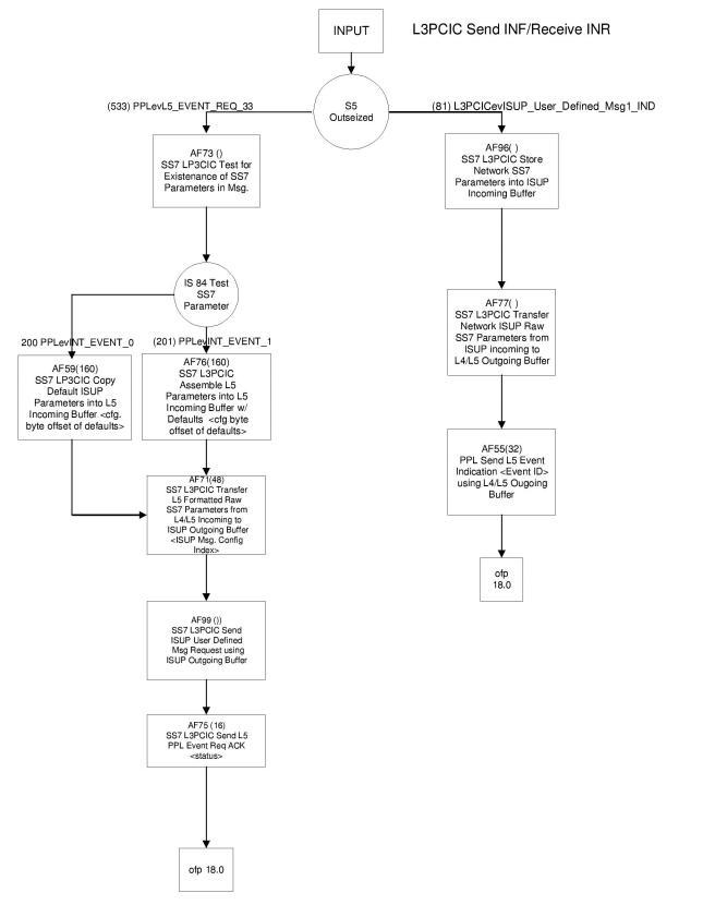 To facilitate the passing of user-defined ISUP messages, add events and atomic functions to ISUP CPC and L3P CIC. L3P CIC Atomic Function (AF) 99 allows L3P to send a user-defined ISUP message to ISUP. ISUP CPC AF 64 sends an incoming user-defined ISUP message to L3P. AF 65 sends an outgoing user-defined ISUP message to SPRC. For an example of L3P CIC customization, see L3P CIC Send INF/Receive INR and L3P CIC Send INR/Receive INF.