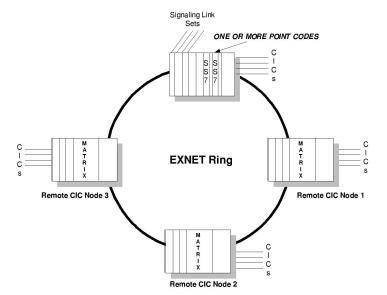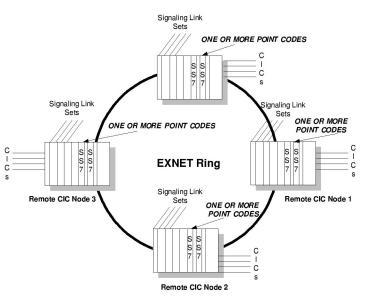 Prior to SS7 over the EXNET ring, if there were four remote nodes in the system, each node would have a Point Code assigned for the SS7 stack and there would be at least four Point Codes on the ring Previous Methodology for Point Codes (Ethernet not shown) . To the network, each CSP appeared as a separate entity, and the CSP was not really functioning as a single SP. This reduced the efficiency in routing, particularly in defining address locations where connections have been made. This could have led to problems in data transfer and to time delays. Cost was also a major concern. Since each SP required separate signaling links, along with redundant links, the monthly lease costs became prohibitive.