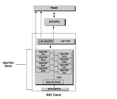 The figure below illustrates the functional modules involved in the implementation of SSUTR2 on the SS7 card, and shows how the signaling stack integrates into the Excel platform architecture.