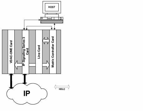 The line cards T-ONE, E-ONE, J-ONE, DS3, and VDAC-ONE (or IP Network Interface Series 2) card communicate with the Matrix Controller Series 3 over the internal HDLC bus. In addition, the IP Signaling Series 3 card and the VDAC-ONE (or IP Network Interface Series 2) card connect directly to the IP Network. The Host, IP Signaling Series 3 Card, and Matrix Controller communicate over the Ethernet LAN.