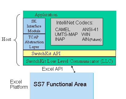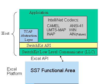 The IN application, codecs, and SwitchKit reside on the host computer, using the SS7 services of the Excel platform.