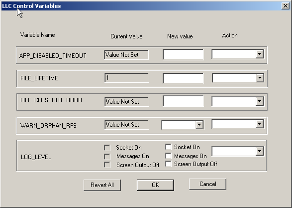 5 If you want to change the environment variables to their values at the startup of LLC, select Revert All and click OK.
