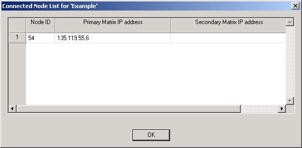 To monitor the nodes that the CSA is connected to select Monitor® Connected Node List. The Connected Node List for.... opens showing the Node ID, primary Matrix IP address, and the secondary Matrix IP address (if applicable).