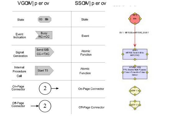 PPL state machines use symbols to represent states, atomic functions, and events. These correspond to standard Specification and Description Language (SDL) symbols as shown in the figure below The PPL symbol for a state that is internal is denoted with an "I" in front of the "S".
