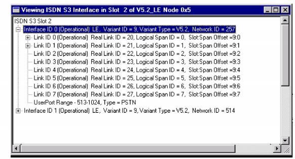 To view the V5.2 interface configuration, double-click the ISDN Series 3 card (labelled ISDN S3) for the V5.2 interface in the node view window. The next dialog box opens: