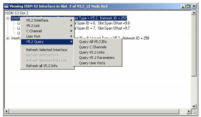 To perform a query of the V5.2 interface configuration, select the menu, Provisioning®V5.2®V5.2 Query or right-click in the Viewing ISDN S3 Interface... dialog box.