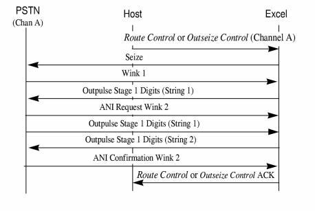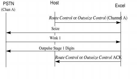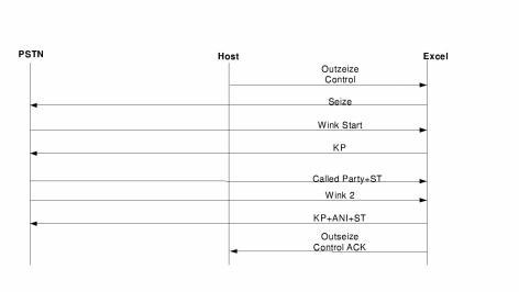 The example call shows the host instructing the CSP to initiate an outbound call with E&M Wink Start signaling. Using the Outseize Control message, the host can have varying degrees of interaction with the CSP. The host can send each instruction separately, use a list of instructions preprogrammed on a channel with the Outseize Instruction List Configure message, or a combination of both.