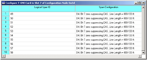 5 Click OK to close the dialog box. Your span configuration is now displayed in the T-ONE Card configuration table.