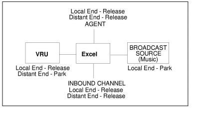 Release Mode Diagram illustrates the preceding examples. Both release modes for the inbound channel are set to release. Therefore, when the connection is torn down, it will be parked only if the distant-end release mode of the other channel is set to park (as is the case for the VRU and the Broadcast Source).