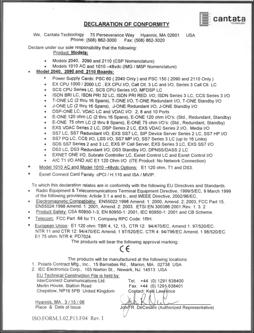 In this section, you can find the European Declarations of Conformity. Refer to the Cantata salesperson for the latest copies.