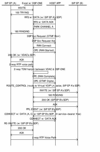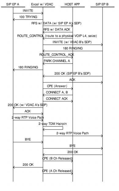 The following call flow shows how a traditional bearer-switched SIP-to-SIP call is established through the CSP. The CSP acts as a back-to-back user agent in that the SIP end-points signal with the CSP only, and connect to VDAC RTP ports. The VDAC RTP ports are internally connected over the Time Slot Interchange (TSI) fabric for an end-to-end speech path. This internal connection is the "hairpin."