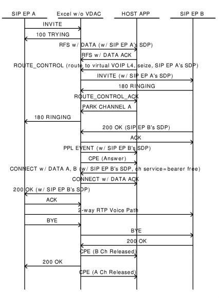 The following call flow shows Call Agent switching with host application control. This call flow is a typical example of how a host application controls and participates in network signaling data transfer from one side to the other. From the OAM&P perspective, all Call Agent calls require host applications to configure virtual span/channels in the system. Virtual span/channels are essentially span/channels assigned to virtual slots that contain virtual VoIP cards. Additionally, you must configure the router so that virtual span/channel-based resource groups are defined and associated with appropriate route lookup rules.
