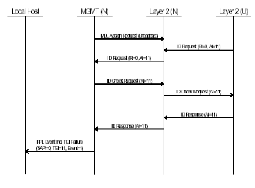 The procedure below shows a check procedure being initiated when a TEI is already assigned. The ID Check Response message returns the same TEI, and the TEI failure is propagated to the host.