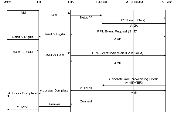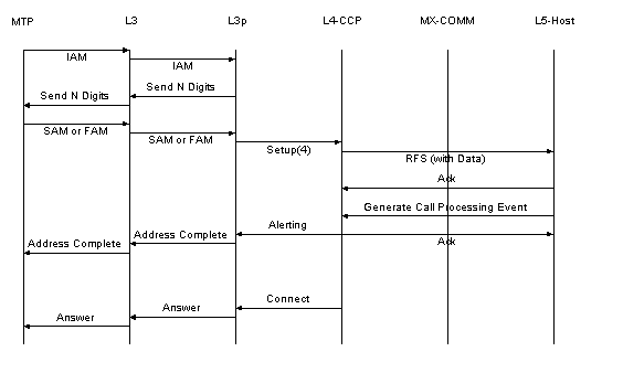 The following is a call flow diagram in which a successful call is originated from the host. All address digits are present in the Outseize Control message, therefore an IFAM is issued to the lower layers.