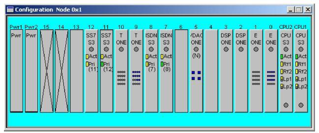 The node view, which looks similar to a CSP, is used to add and configure cards, as well as monitor the configured cards. Each card is displayed with the card type, an indicator for in-service and out-of-service, and other card specific indicators are shown: