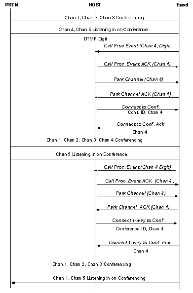 This example shows the API messages transferring a channel from broadcast (listen only) to conference and back again. Dialing "Add Me To Conference" and "Remove Me From Conference" DTMF digit is also shown.