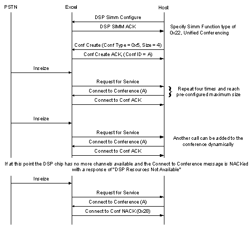 The call flow below illustrates how the host application can configure the CSP to use Unified conferencing. It also illustrates how to dynamically increase the size of a conference beyond the number originally specified in the Conference Create (0x004B) message.