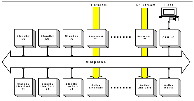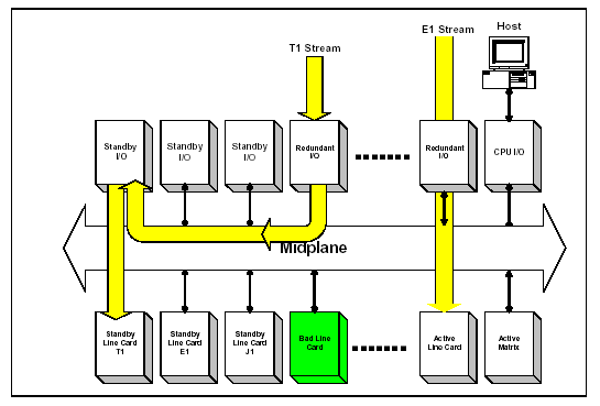 The host then instructs the Matrix Controller to reroute the appropriate T1, E1, or J1 data stream. The Matrix Controller instructs the standby