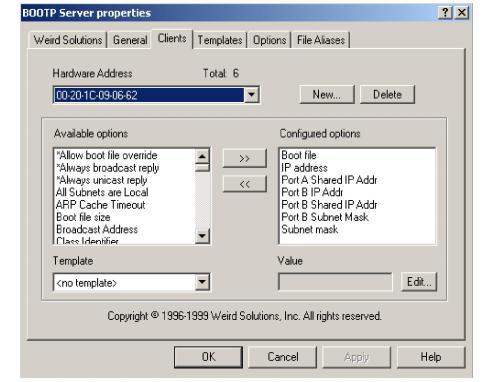 1 Double-click BOOTP Server NT from the Control Panel to display the Weird Solutions BOOTP Server NT dialog box. Select the Options tab.