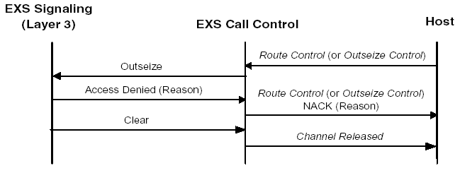 The following call flow shows an example of outgoing call setup rejected by the Signaling layer using Access Denied.