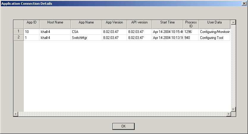 To monitor the SwitchKit applications select Monitor® SwitchKit Applications. The Application Connection Details window opens showing the application ID, host name, application name, application version, start time, process ID and user data.