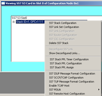 • Right-click the SS7 entry in the view and select SS7 Stack Configuration from the menu.