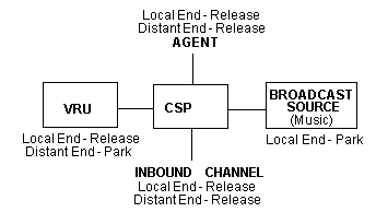 When you are configuring a channel, use local-end release mode so that the channel is not released when a connection is terminated. Consider the previous example for distant-end release mode. To configure a source to broadcast music to the channels waiting for an agent, the local-end release mode of the broadcast channel is set to park. When no channels are connected to the broadcast channel, it parks until another channel is connected. In contrast, if you allow the channel to release, it must be outseized after each connection is broken down.