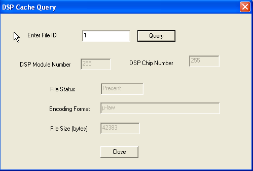 Right-click the DSP-S2 card and select the menu option, Cache Query. Enter a File ID number (decimal or hexadecimal). After you click Query, the other fields in the dialog box become populated. In the next example dialog box, the file resides on the motherboard cache, so the CSP returns a value of 255 (decimal) or 0xff (hexadecimal). If the file resides on a DSP chip, then the dialog box will show the corresponding DSP Module Number and DSP Chip Number.