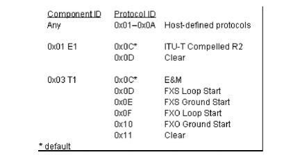 PPL Protocol ID Protocol IDs 1 - 10 are reserved per component for custom protocols. Shown below are two components and their default protocols that are included on the CSP. Default protocols are assigned through other methods such as Trunk Type Configure for the T1 protocols.