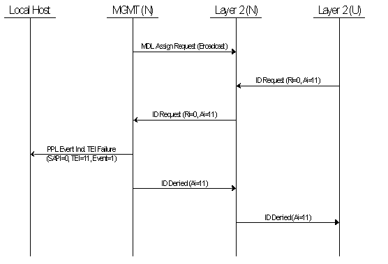 The procedure below shows an ID Request from the user side, requesting TEI 11. Management checks the Configuration database but cannot find TEI 11 listed, so it issues an ID Denied. Management sends a PPL Event Indication message to the local host to indicate that this TEI failed assignment procedures.