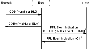3. Upon successful completion of the maintenance blocking procedure, the CSP alerts the host by sending a PPL Event Indication message. The PPL Event Indication will include an SS7 Parameters ICB containing parameters from the BLA. The host should not initiate any outgoing call without first sending a PPL Event Request message of Maintenance Unblock.