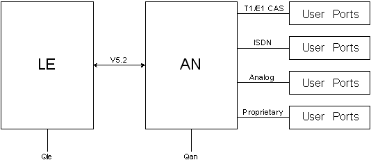 The V5.2 LE is the "network side" that resides at an End Office (EO) and provides the EO and Mobile Switching Center (MSC) functionality. This functionality includes additional CLASS features and services typically provided by an LE. The AN receives V5.2 data from the LE, then passes it to two-wire analog, ISDN, Frame Relay, Wireless, Fiber Optic, or any other Customer Premises Equipment (CPE).