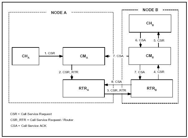 This diagrams in this section show calls routed across two nodes.