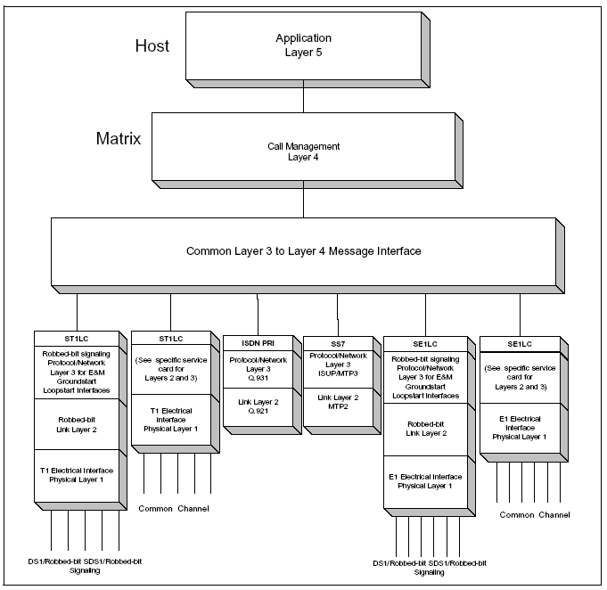 The software layers are shown in the figure below. Call control occurs on the Matrix Controller card and front end protocol processing occurs on the line cards. This distribution ensures accurate, real-time signaling analysis and response within the Protocol/Network layer, with one processor dedicated to 192 ports.