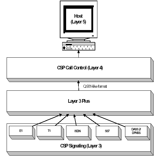 The CSP Layer 3 Plus binds together layers 3 and 4. Layer 3 Plus resides on smart line cards and converts information from layer 3 into a common message interface. Regardless of the signaling protocol residing on a line card, all communication between layer 3 and layer 4 uses this common message interface. Layer 3 Plus also manages application-specific variants for call control.