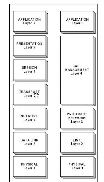 The software is modeled on the standard, seven-layer OSI network protocol stack, but there are important differences between the two. Note that the Call Control layer is a combination of the Presentation, Session and Transport Layers of the OSI network protocol stack, as shown in the figure below: