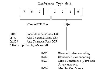 You can use the Conference Type field in the Conference Create message not only to specify a conference type, but also to specify the channels and DSP resources to be used to establish the conference. The lower nibble (the right-most four bits) of the Conference Type field indicates the conference type. The upper nibble (the left-most four bits) indicates which channels and DSP resources can be used to establish the conference.
