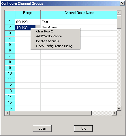 2 Right-click in the Range cell of the channel group that you want to delete, add, or modify. Select an option from the pop-up menu. See the next screen shot.
