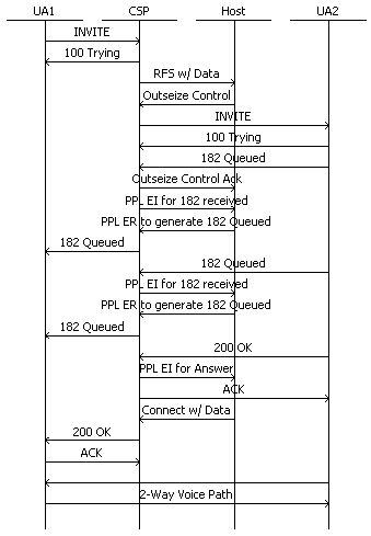 The following call flow shows messages involved with the reporting and generating SIP 182 Queued message.