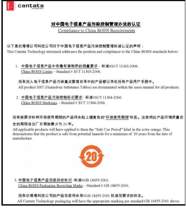 This section provides the China Restriction of the Use of Certain Hazardous Substances (RoHS) Declaration of Conformity and the Restriction of Hazardous Substance Table. Refer to the Cantata salesperson for the latest copies.