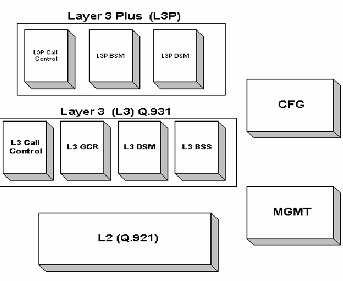 • This component implements Q.931 variants, which has state tables that are SDL equivalents with some validation logic embedded. This component is managed per call reference, and manages B channel bearer capability as well as B channel allocations.