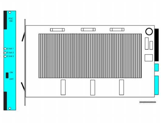 The PSC-150 power card supports the power requirements of the standard CSP 2090 chassis and the CSP 2110 chassis. A second PSC-150 card provides redundancy. This card converts the -48 V DC input power to +5 V DC using three power modules.