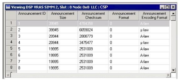 In the DSP VRAS card view you see the configured announcement ID, size, checksum, format and encoding format.