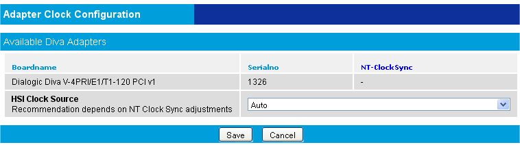 This feature is only available on specific Diva BRI and V-xPRI Media Boards. Clock synchronization may be necessary, if one port of the Diva multiport Media Board is connected directly to the ISDN line and the other ports are connected to the PBX, so that the clocks of the ports may drift. With the clock synchronization, the ports configured as NT are synchronized with the TE ports on the same Diva Media Board.