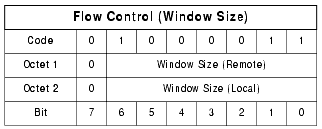 The window size for transmissions from the remote DTE is represented in bits 6 to 0 of the first octet in the parameter field. The window size for transmissions from the local DTE is represented in bits 6 to 0 of the second octet. Bit 7 of each octet must be 0.
