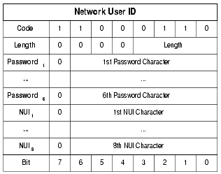 Each octet in the Password and NUI fields contain a single ASCII character. The maximum Password length is 6 characters. The maximum NUI length is 8 characters.