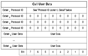 The format for Call User Data consists of four protocol identifier octets followed by a maximum of 12 octets of the call user data. Octets consist of bits numbered 7 to 0, where bit 0 is the low order bit and is transmitted first. Octets are consecutively numbered starting from 1 and are transmitted in this order.